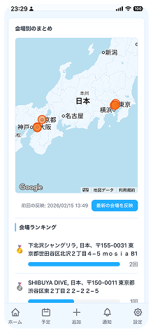PROプランでは、行ったライブハウスをランキング化しマップにまとめます。よく行くライブハウスがわかります。